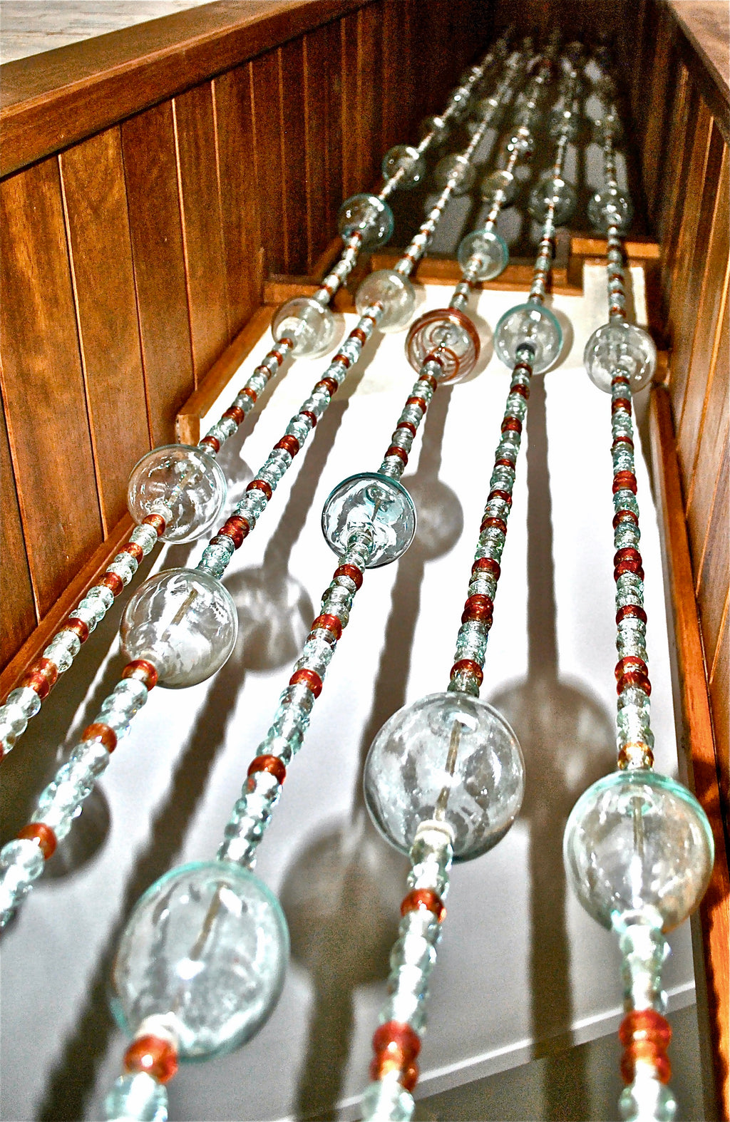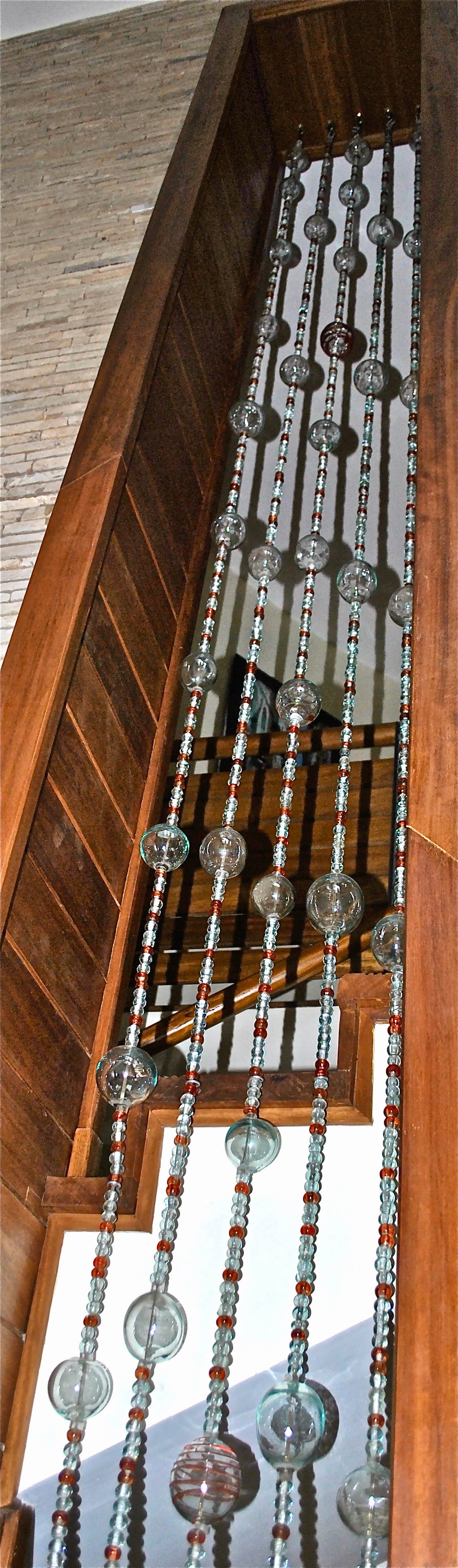 A custom commission for a staircase in a town house in Nairobi. Mainly designed as a safety feature to stop the toddler taking the fast way down. Tensioned strands anchored top and bottom. Detailed with blown elements.