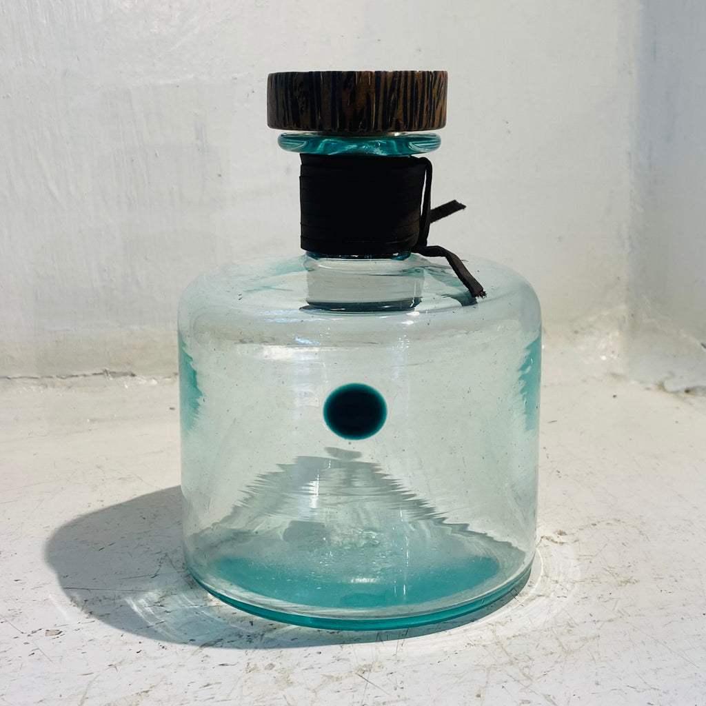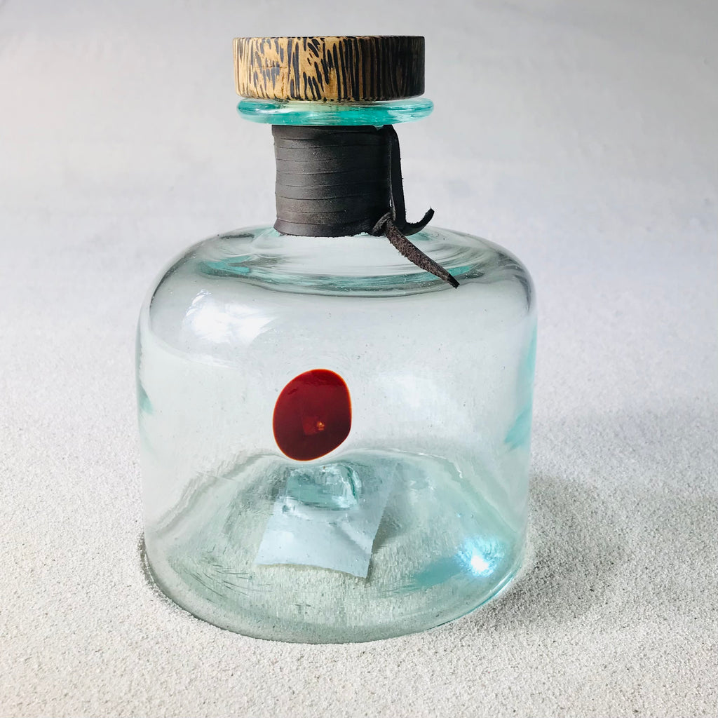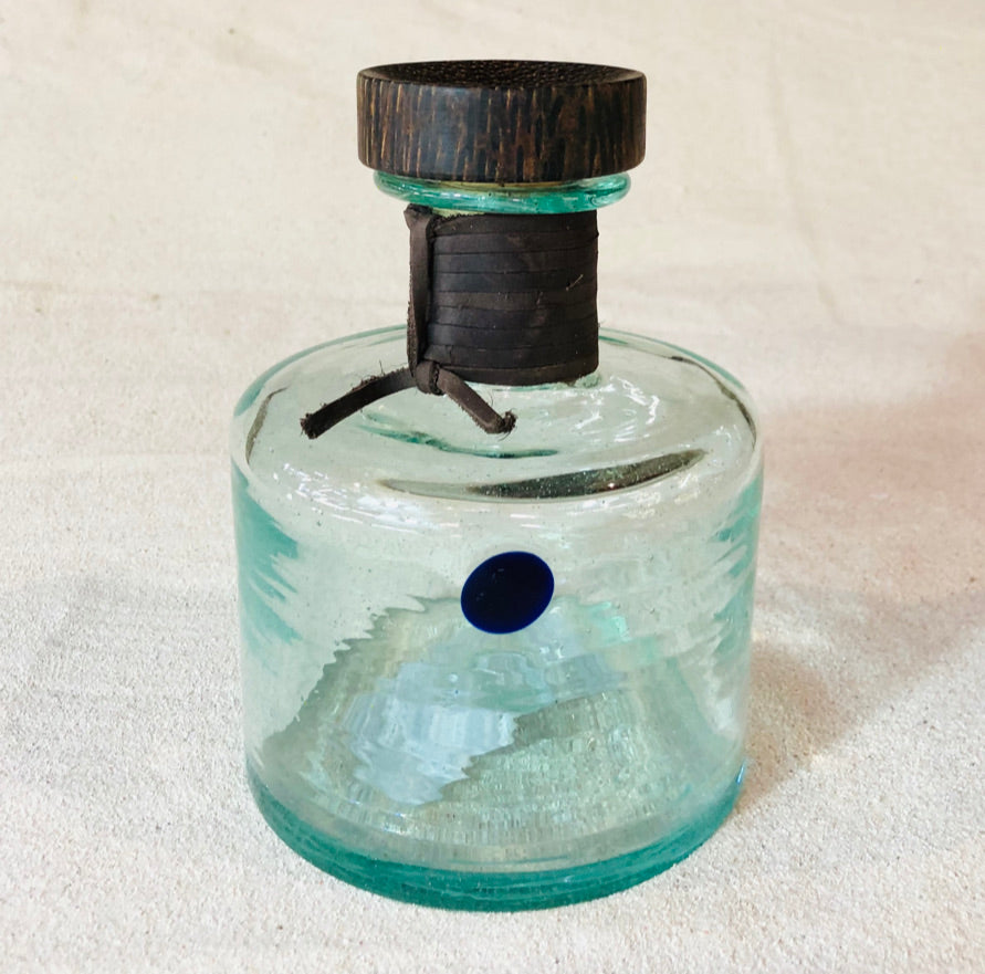 Supplied empty with a hand made palm wood stopper and neck decorated with leather webbing. No hot liquids please - hand wash only.