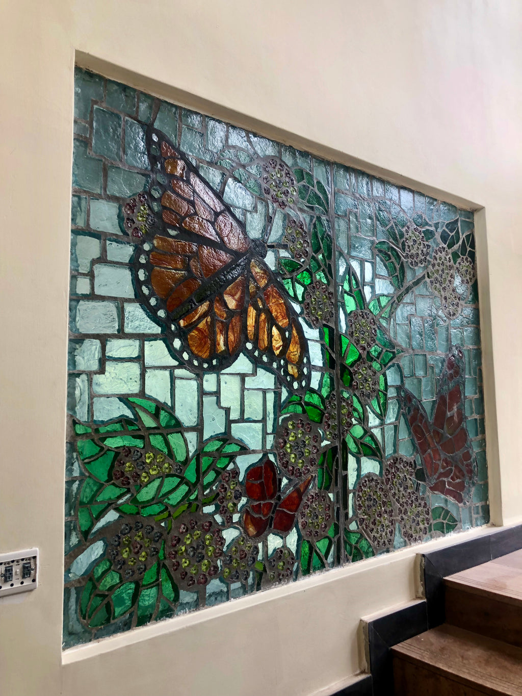 For a client in Kitisuru, allowed us to play with the various techniques at our disposal, although the brief was - it must not look like 'Kitengela'. Slightly tricky, considering we needed to (and did) use pretty much all the tools at our disposal on this. The butterflies were an adjunct, but worked well to tie in the dalle de verre version with the funky fencing ones. The same beads used in the lantana flowers in the mural were casted into the dalle panel.