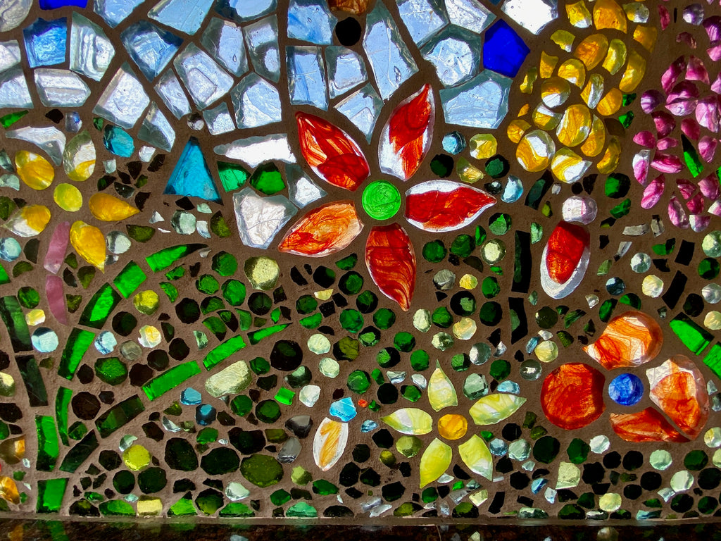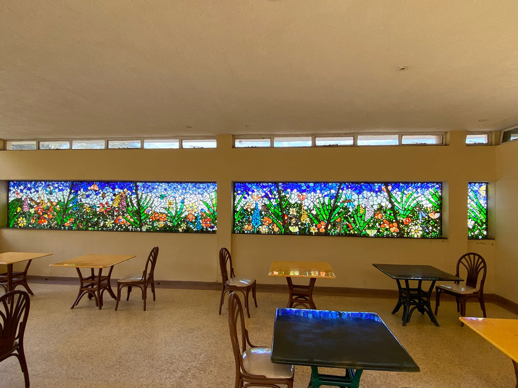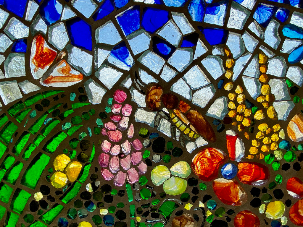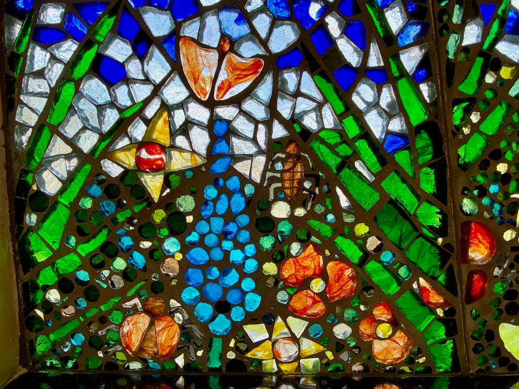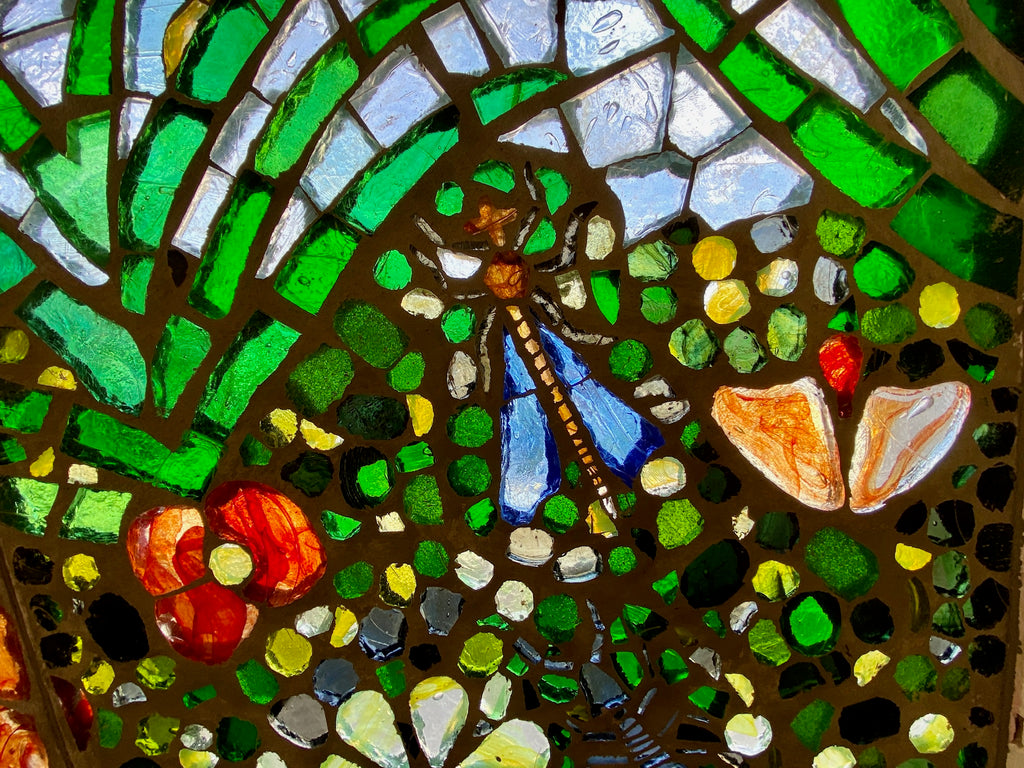 A dalle de verre tableau of verdant herbaceous insect-ness, in the ICIPE HQ, Nairobi.