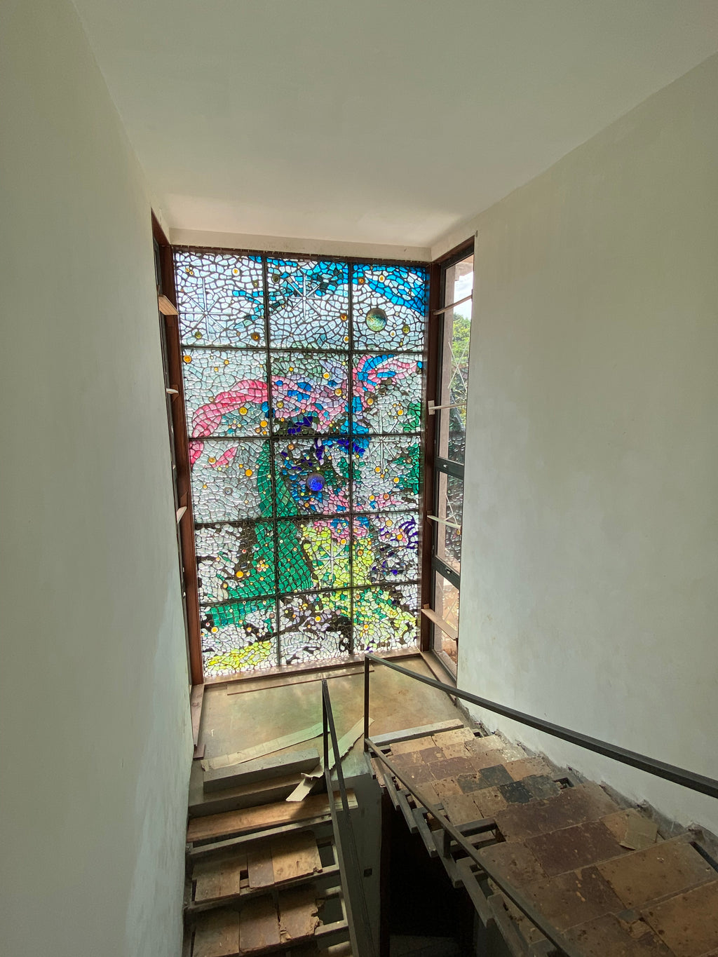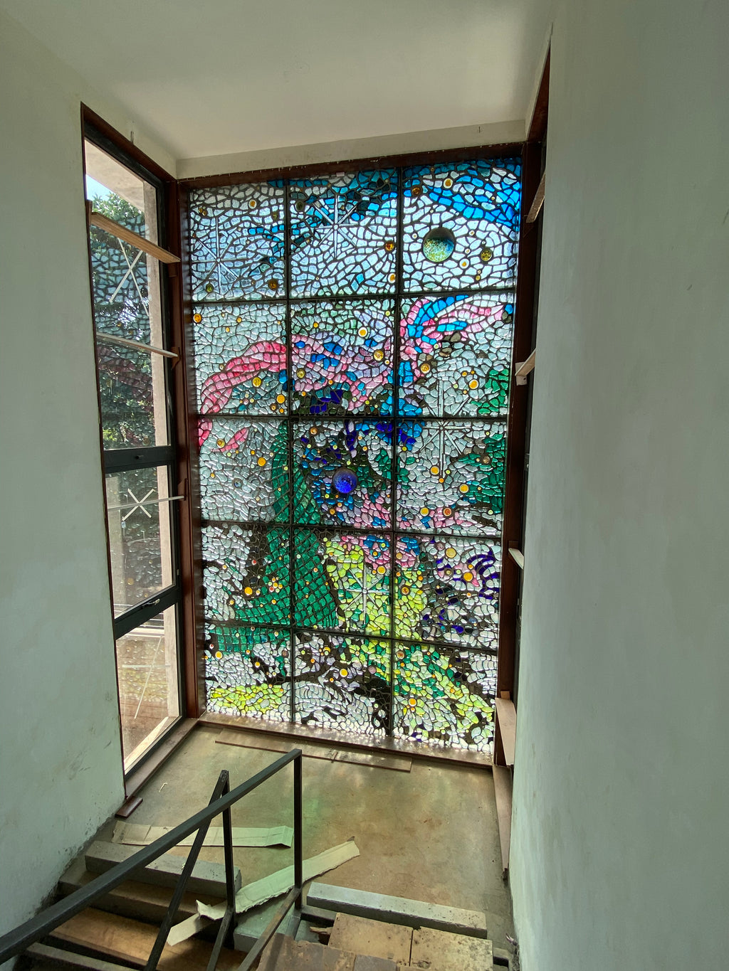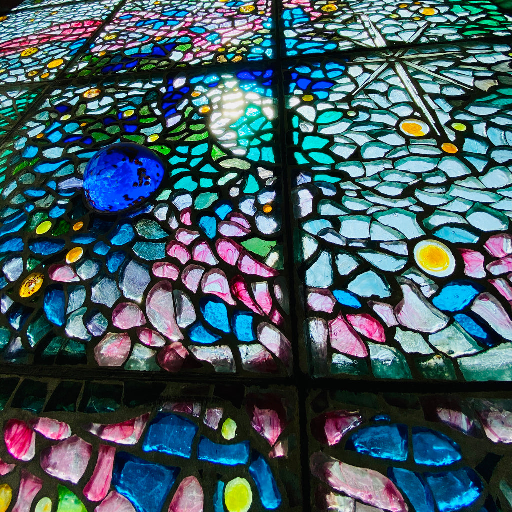 A staircase window for a Nairobi townhouse. With custom optic blocks for the stars, a hybrid teal specially made for this panel, 3D planets and numerous other bespoke elements contribute to this one off piece.