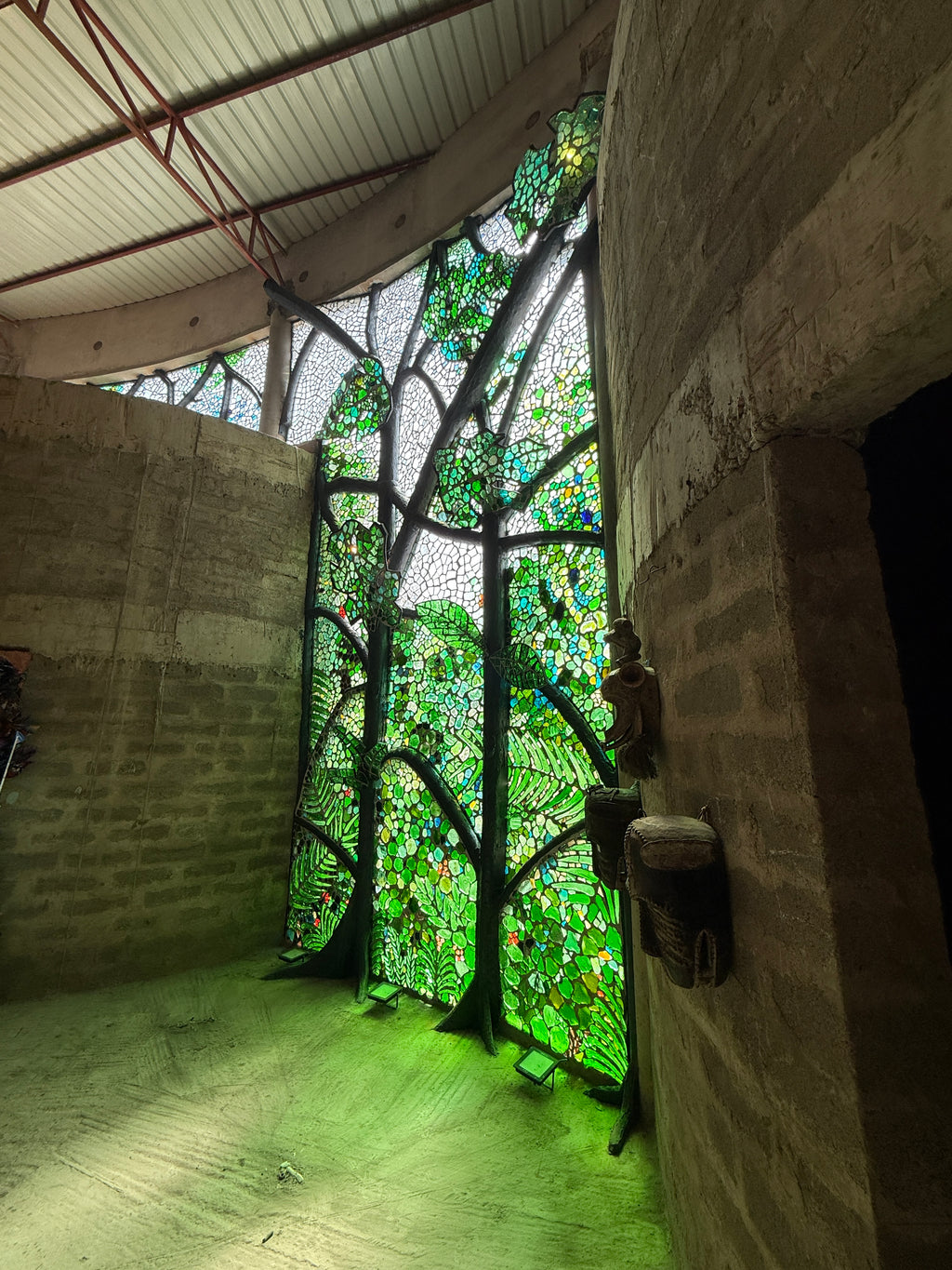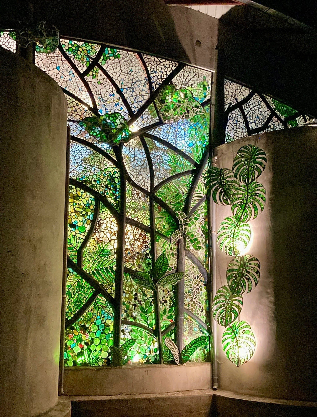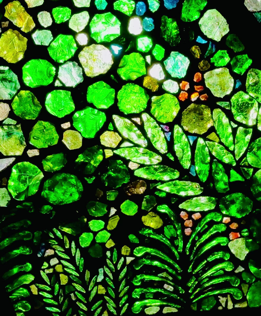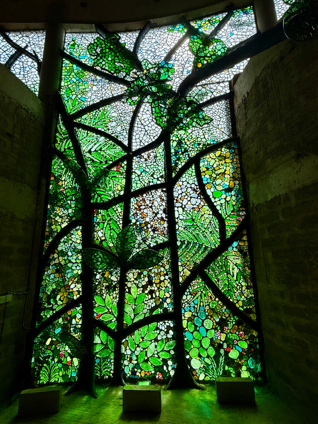 Shards of human detritus, melted, cast, cut & set by hand in a unique mortar of vitreous sand - catching the sun like reflections off leaves in a canopy.