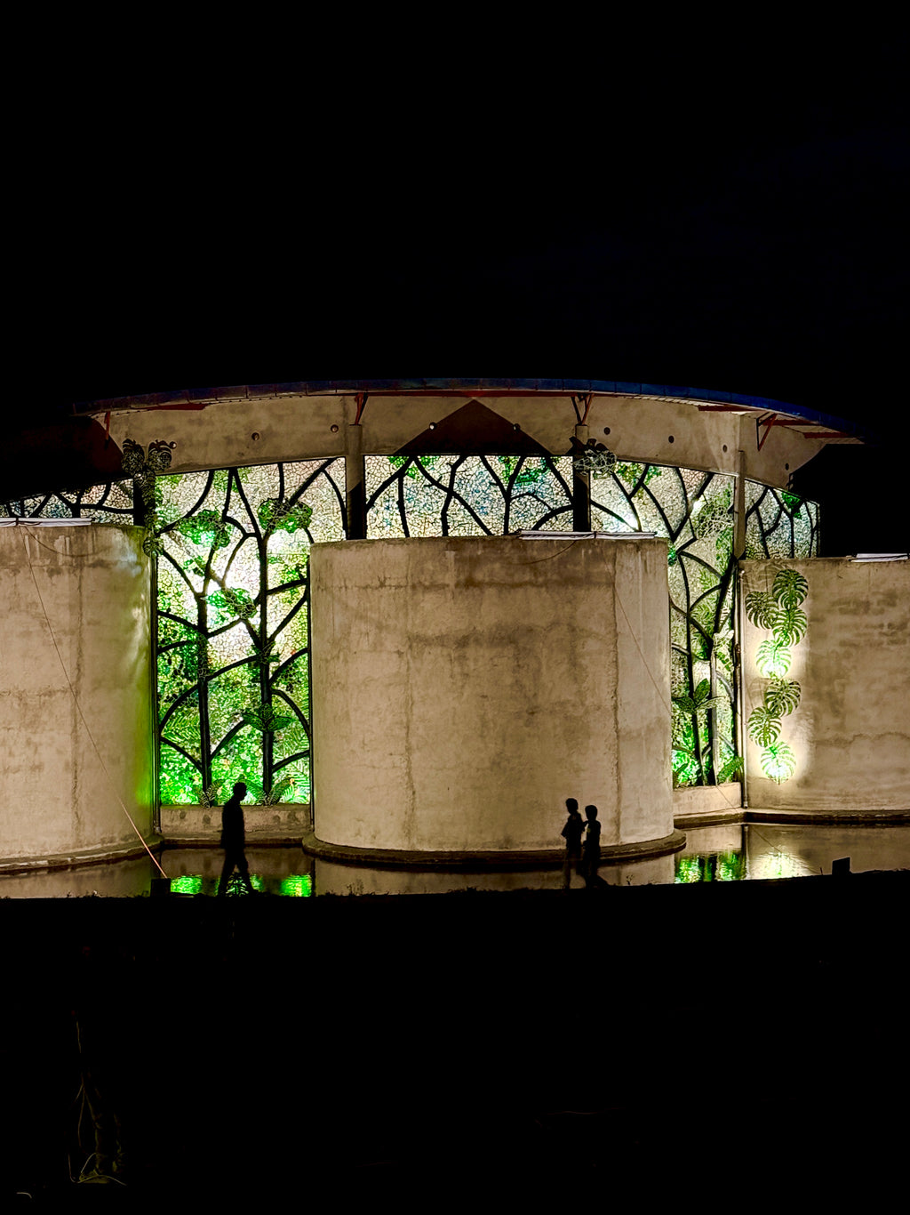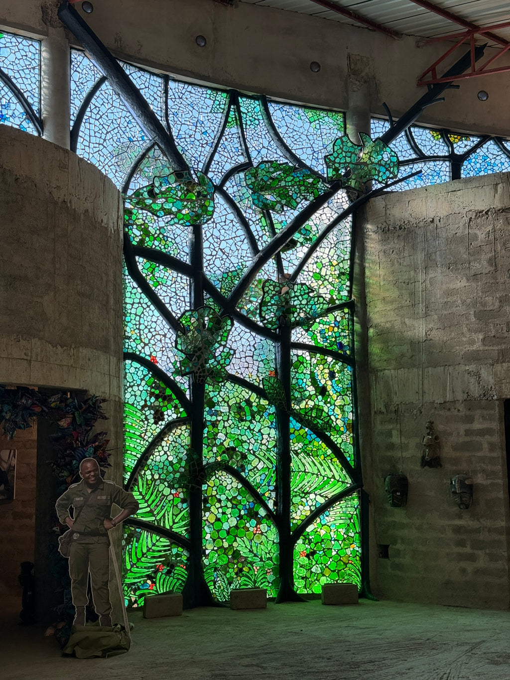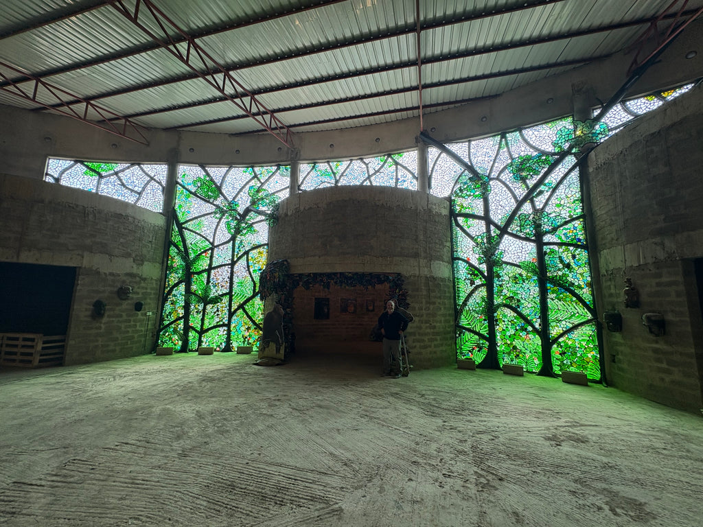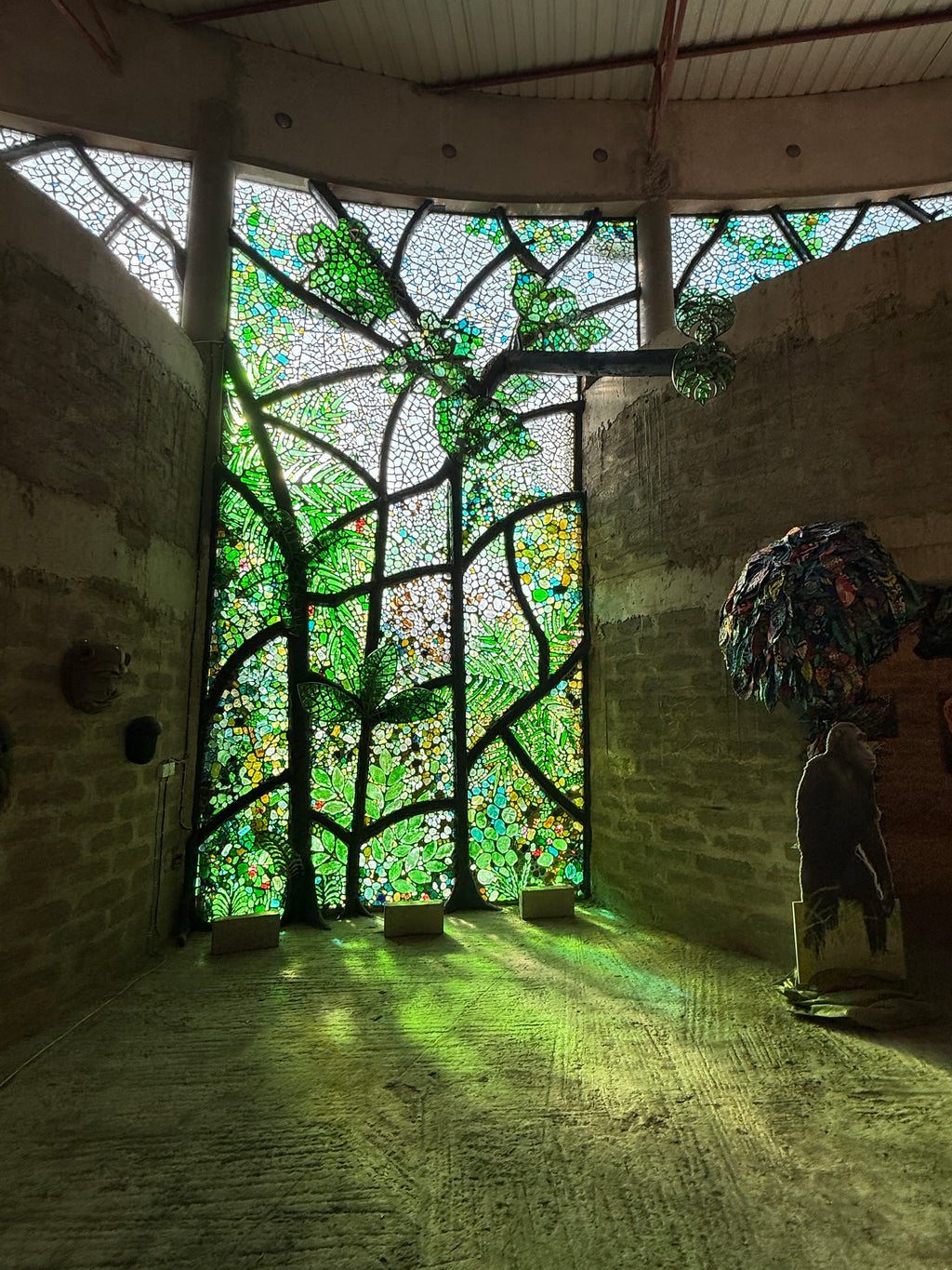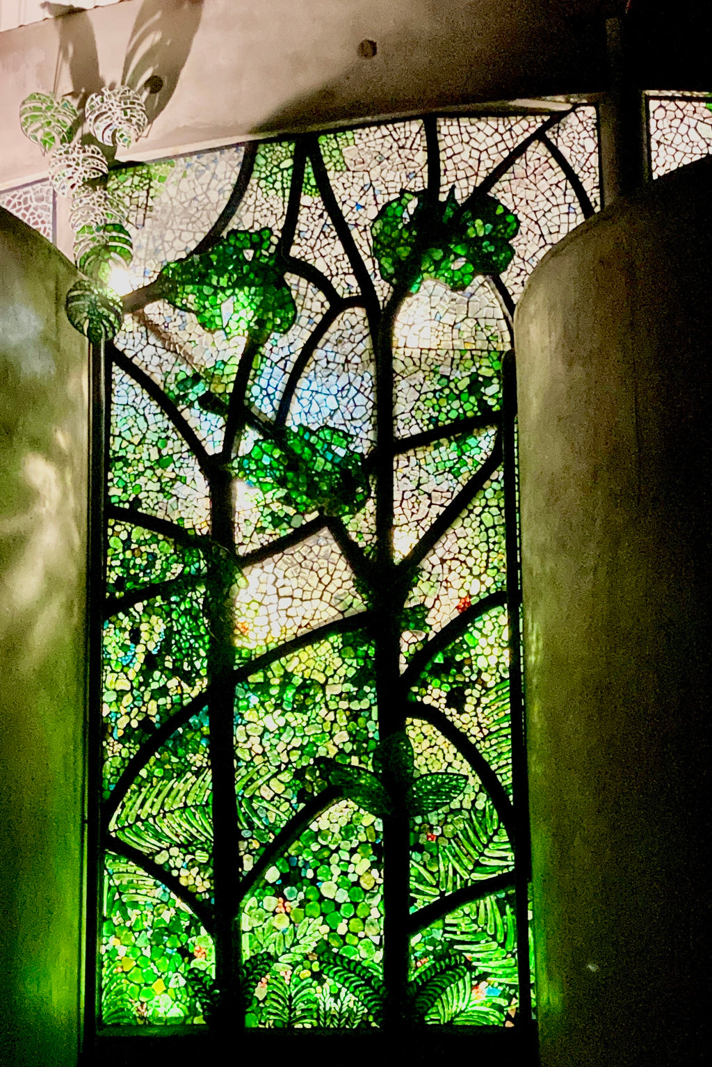 Shards of human detritus, melted, cast, cut & set by hand in a unique mortar of vitreous sand - catching the sun like reflections off leaves in a canopy.