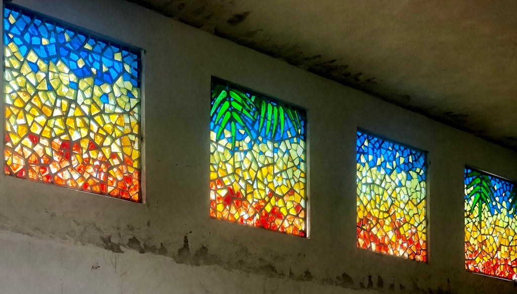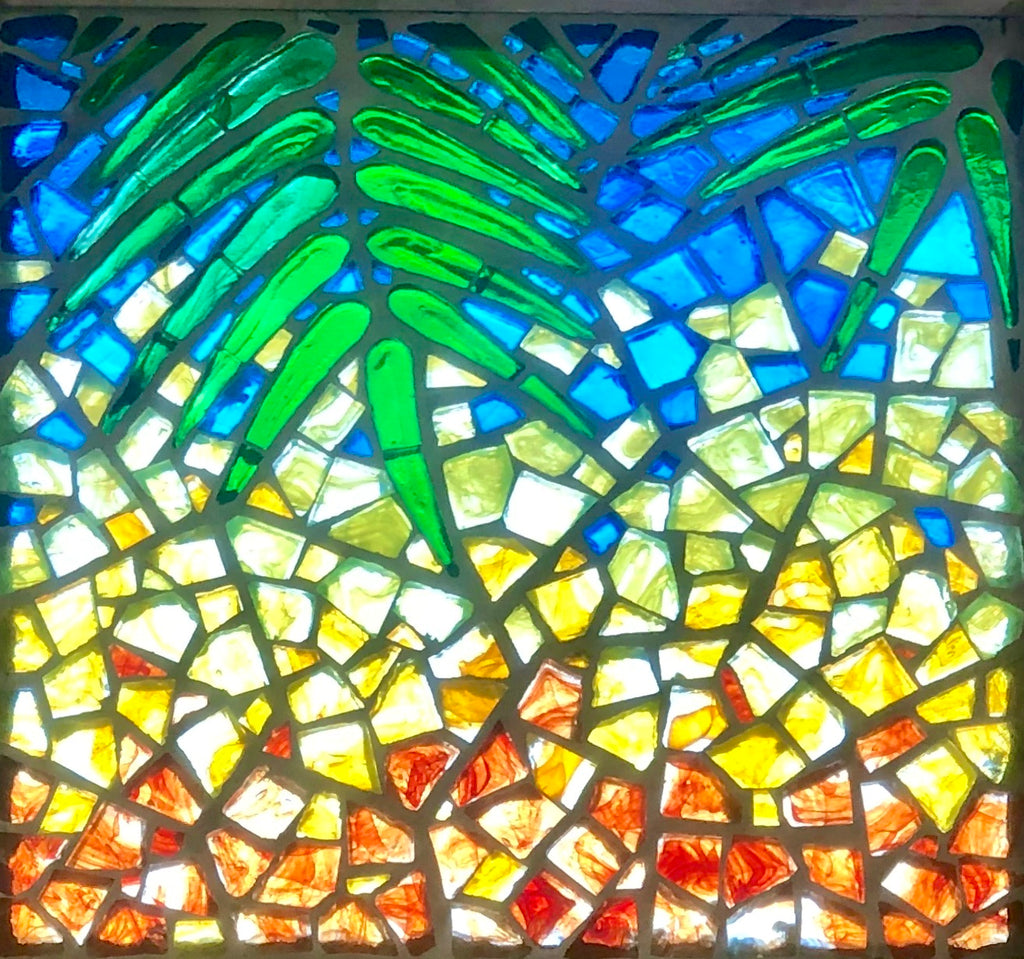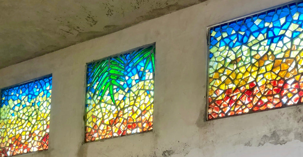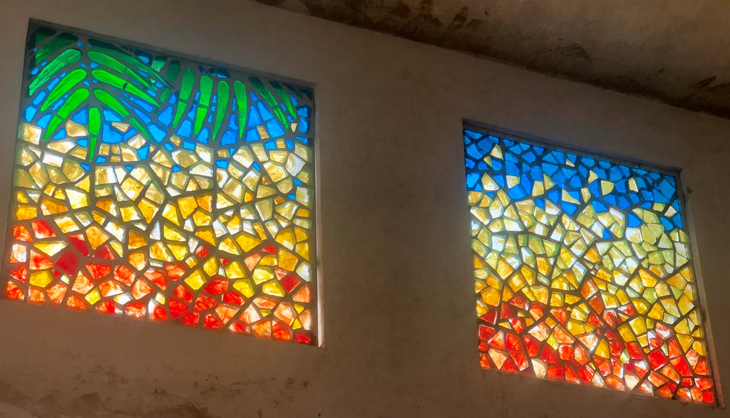 A French technique using thick cast blocks of glass in a cement & steel matrix. Dalle de Verre is used by Kitengela Hot Glass to create tough, vibrant window panels.
