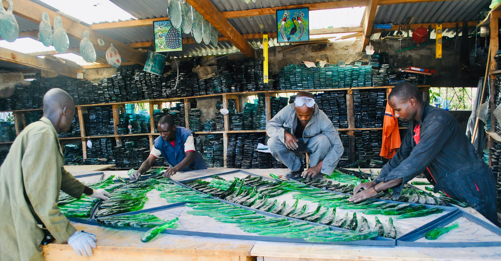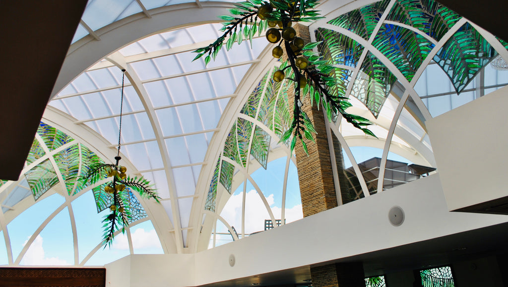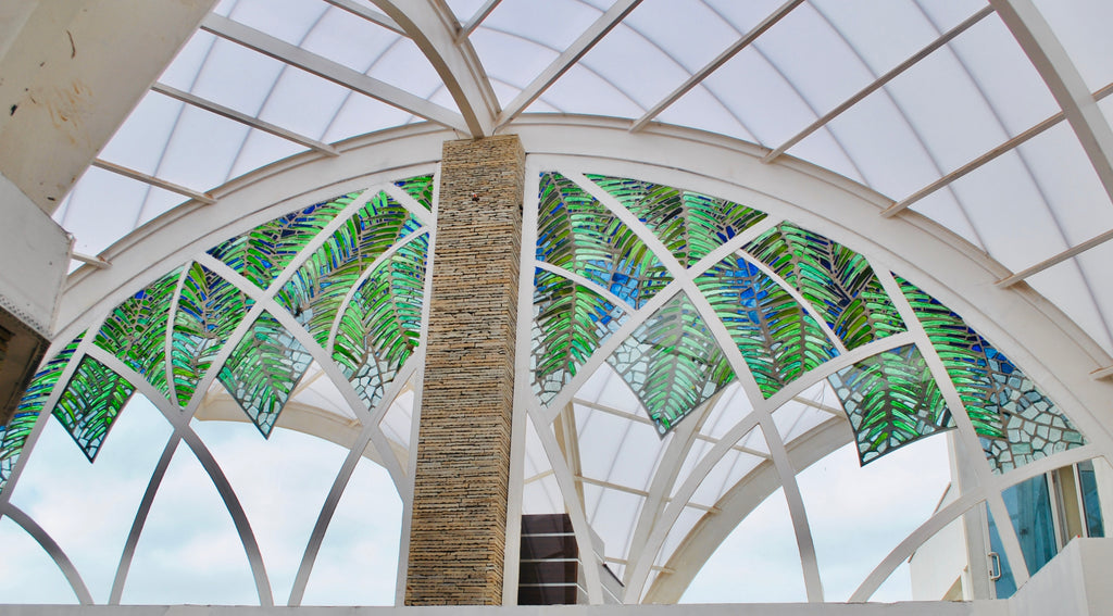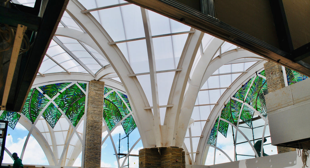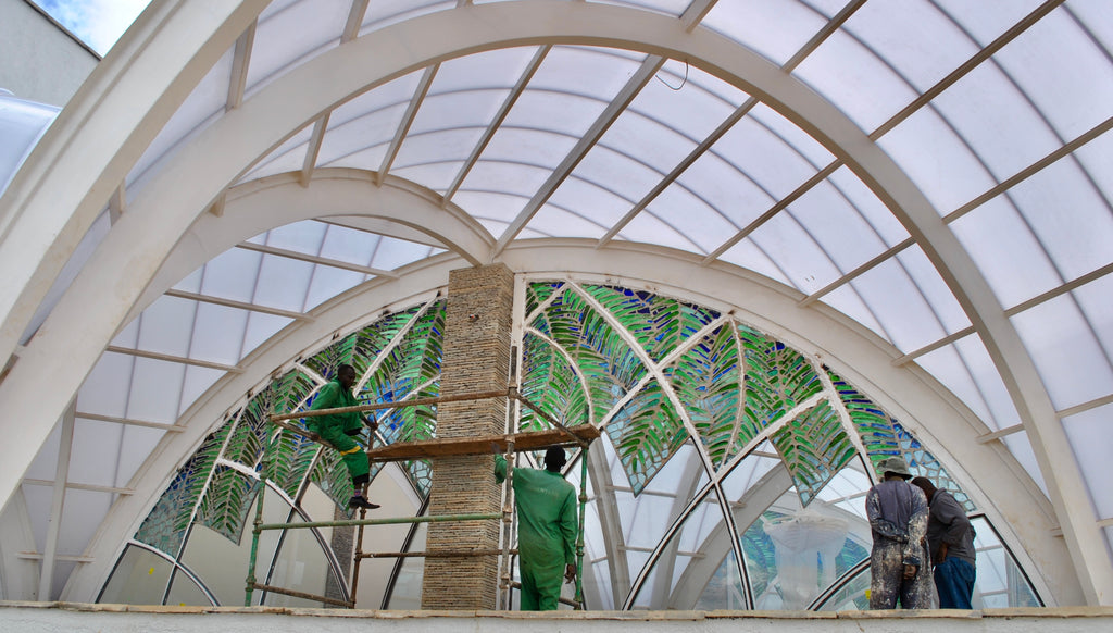 A series of large suspended panels in the Boma Hotel's Johari Restaurant, South 'C', Nairobi, 2010. This was where we prototyped the custom cast palm leaf blocks - all made from old Heineken and Sprite bottles.