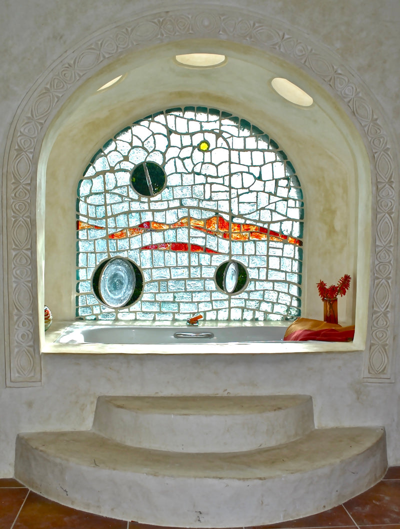 A French technique using thick cast blocks of glass in a cement & steel matrix. Dalle de Verre is used by Kitengela Hot Glass to create tough, vibrant window panels & furniture.