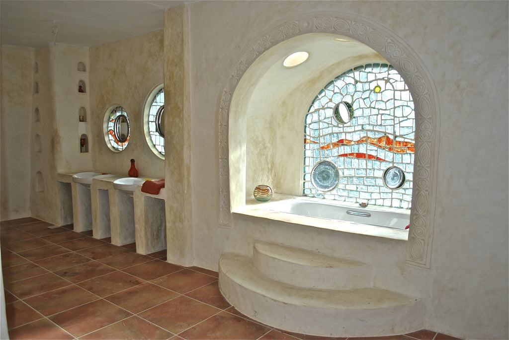 A suite of bathroom panels in a country residence in Oloosirkon. The rotating roundels for the bathroom mirrors and in the panel allow ventilation and light.