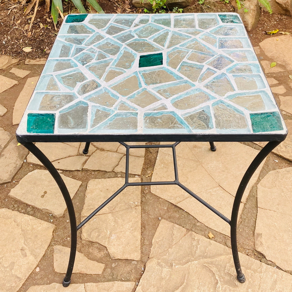 Chunky dalle de verre garden table. Hand-cast blocks of recycled glass, lovingly arranged in unique designs and cast into a cement matrix.