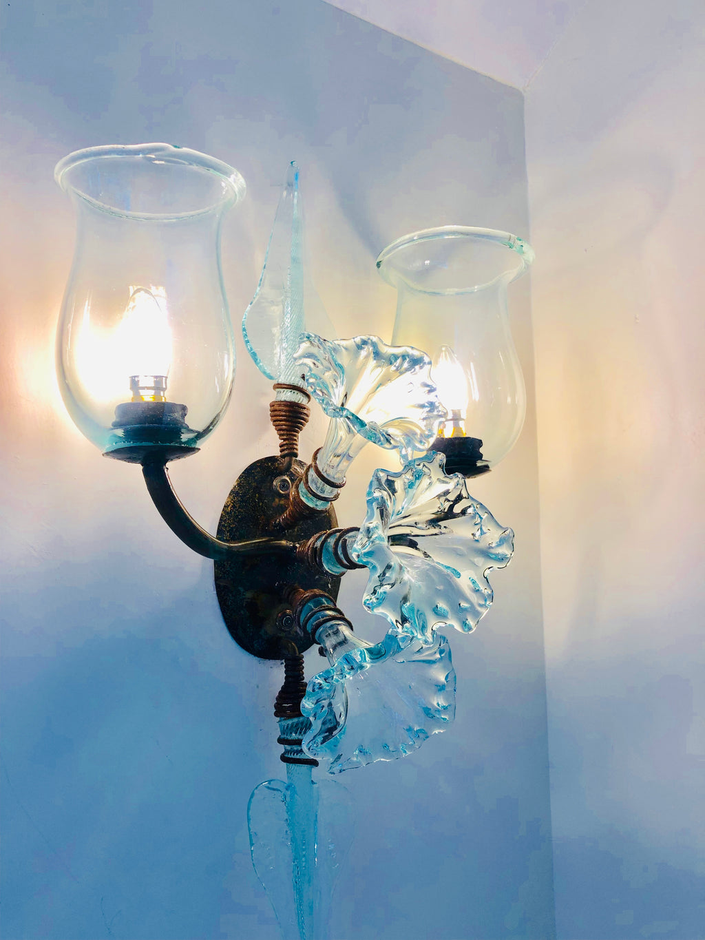 We removed the light cups from the two flowery pieces to accentuate the beauty of the raw glass elements. With bulb tech improving, & more beautiful bulbs being readily available, it's not so necessary to hide the bulb or fitting any more with old school light cups. Having said that, we used them on the wall brackets.