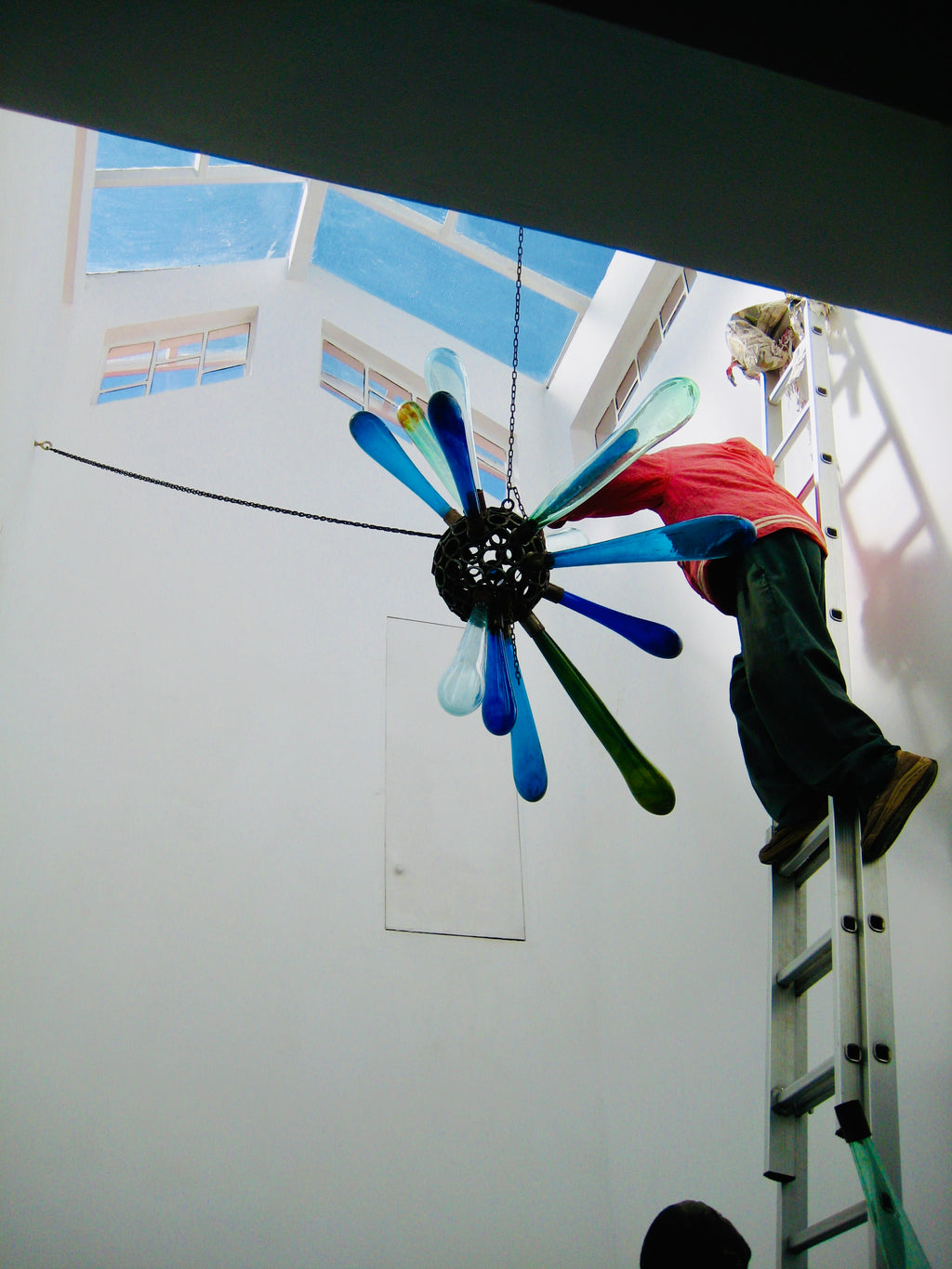 More of a hanging sculpture than a lit piece - perhaps could be added to the 'ambient light' chandelier collection. This was part of the Rahimtullah modern art collection - but their most recent venue didn't have the space, so it came back to our studio, where it currently resides.