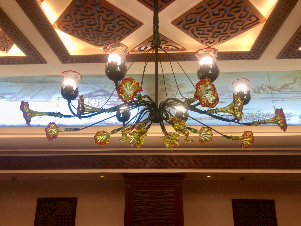 Chandelier 'Serena' 1.8 x 1.2m dia, 8 light cups, yellow w red rim flowers