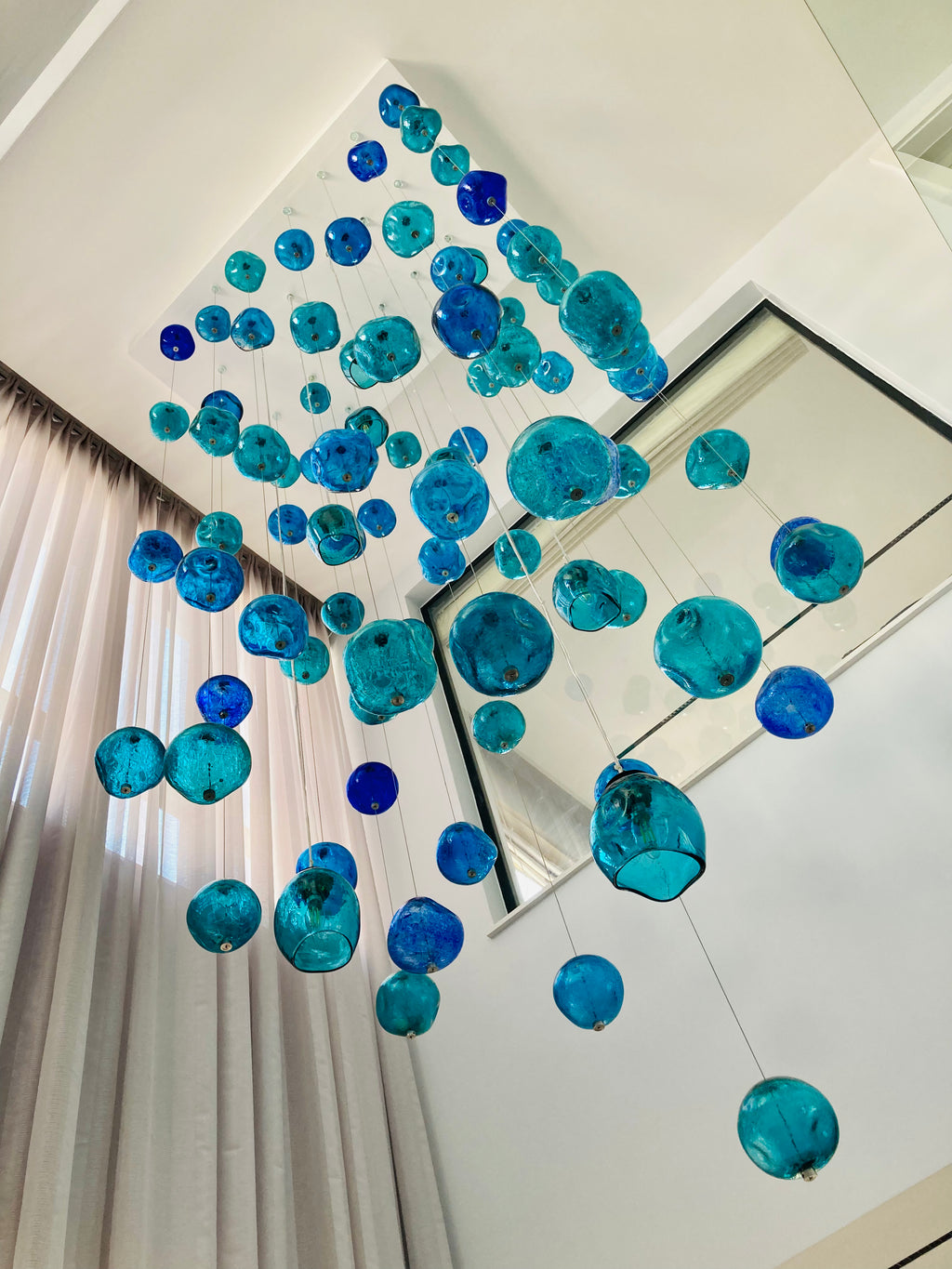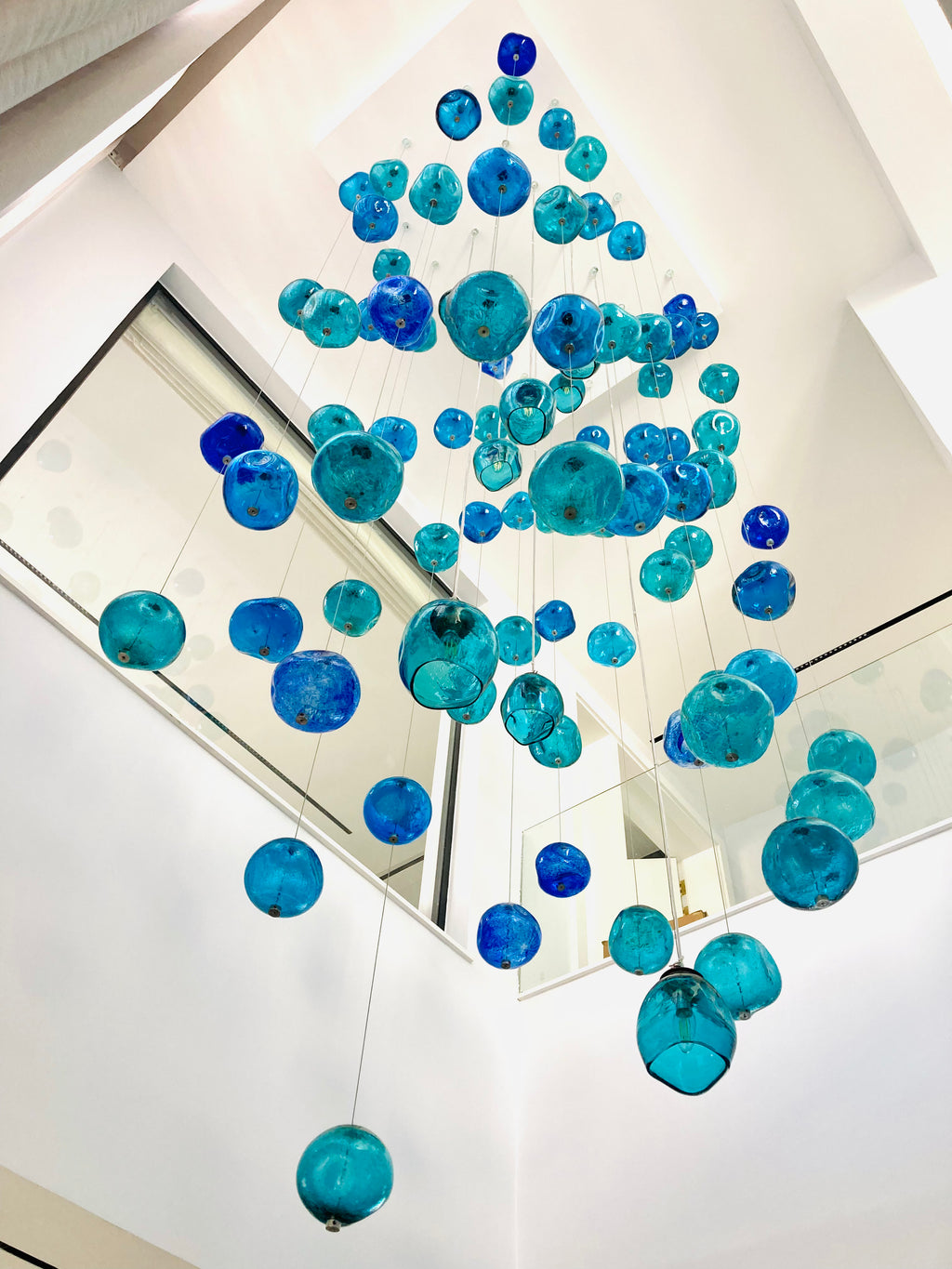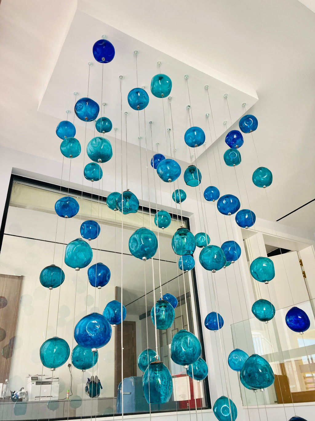 A hanging cluster of LED pendants with surrounding giant blown 'beads' custom made for a client in Nairobi, Kenya. Note the bead ceiling rose detail.