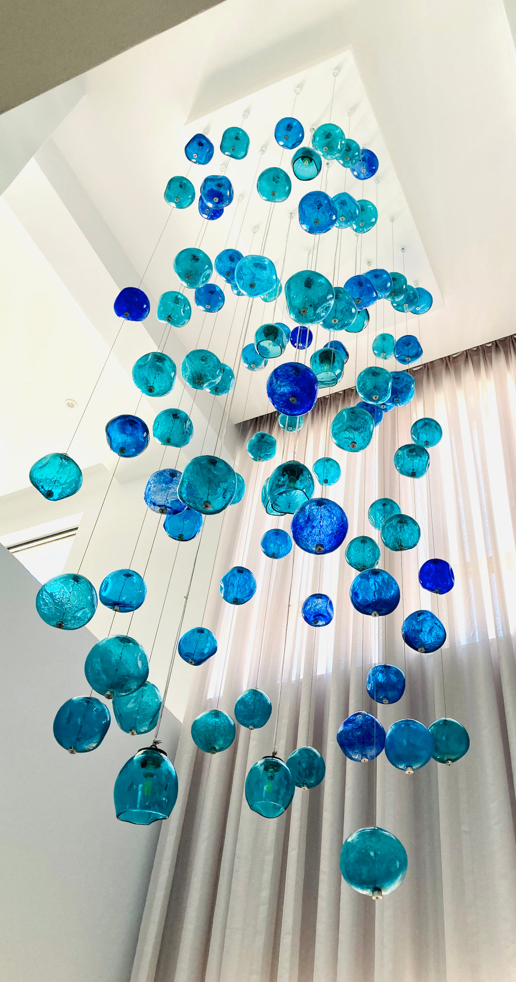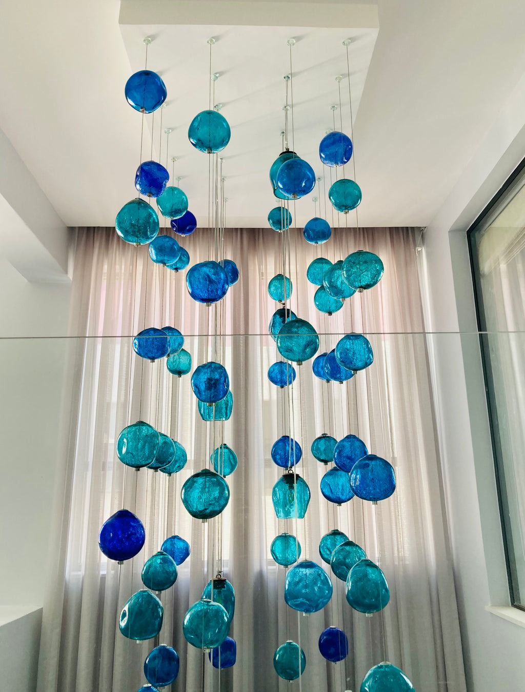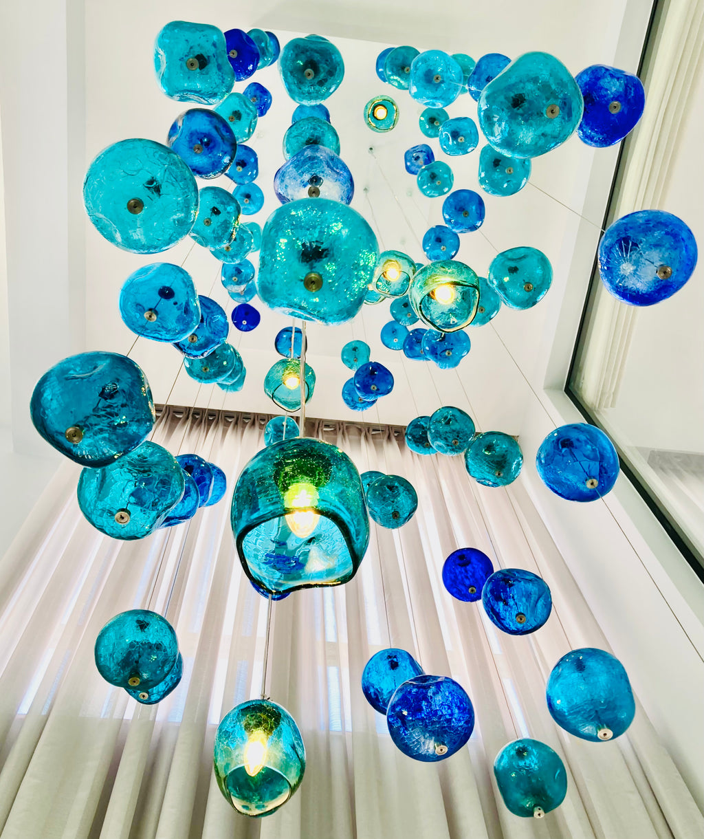 A hanging cluster of LED pendants with surrounding giant blown 'beads' custom made for a client in Nairobi, Kenya. Note the bead ceiling rose detail.