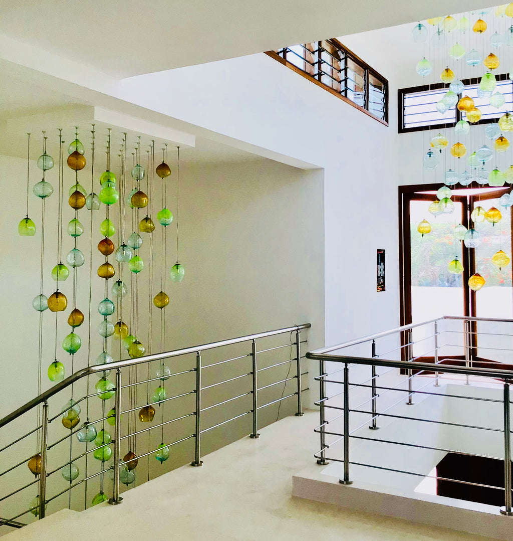 2 hanging clusters of multiple LED pendants with surrounding giant 'beads' custom made for a client in Diani, Kenya. All fittings in stainless steel and ceramic.