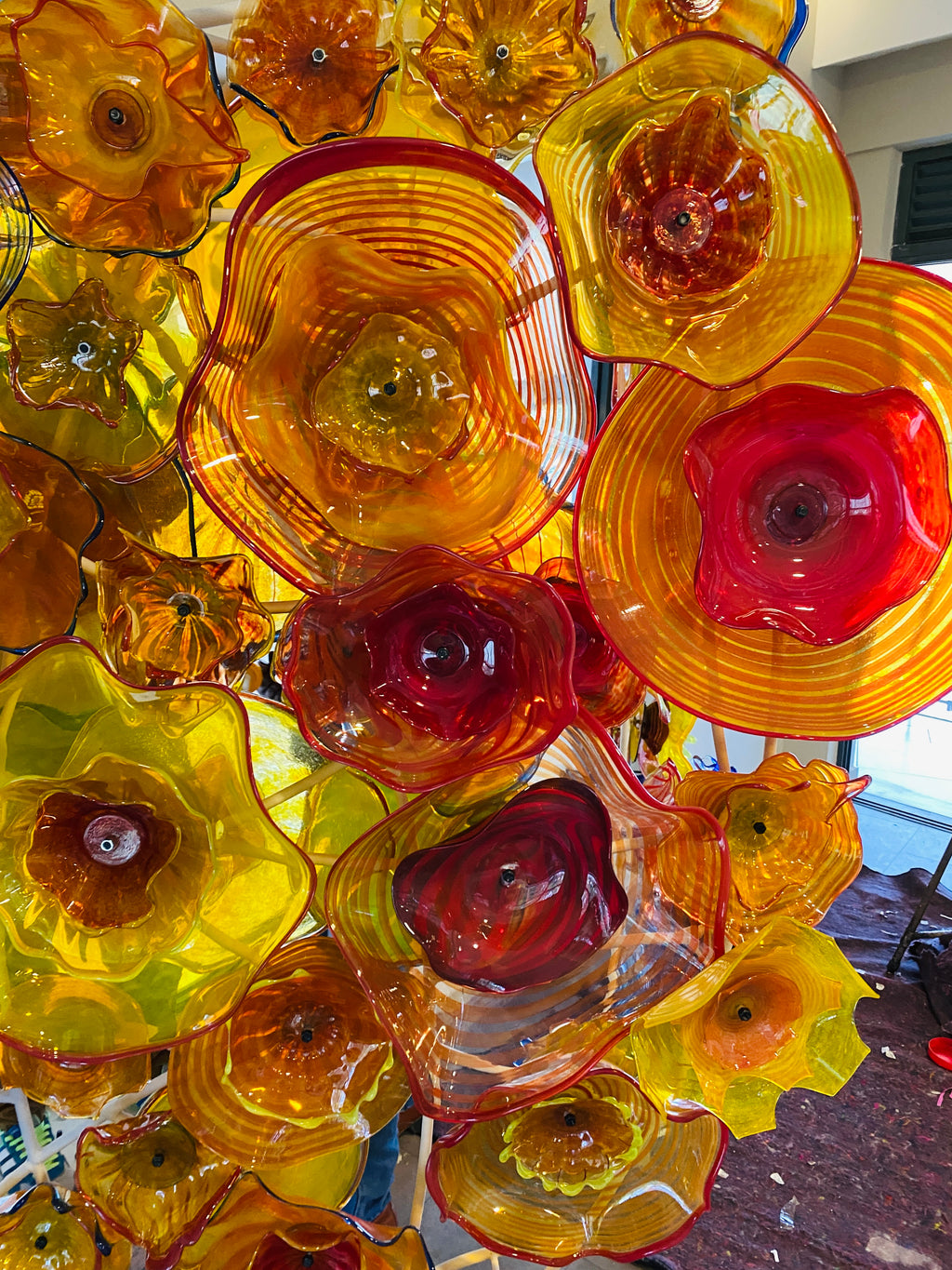 Two pieces in the new dining hall at Rosslyn Academy in Nairobi. Our clients had seen Chihuly's wrok, and wanted a local, recycled upright version of the concept. These are a double sided walls of glass separating the executive lounges from the student riffraff.