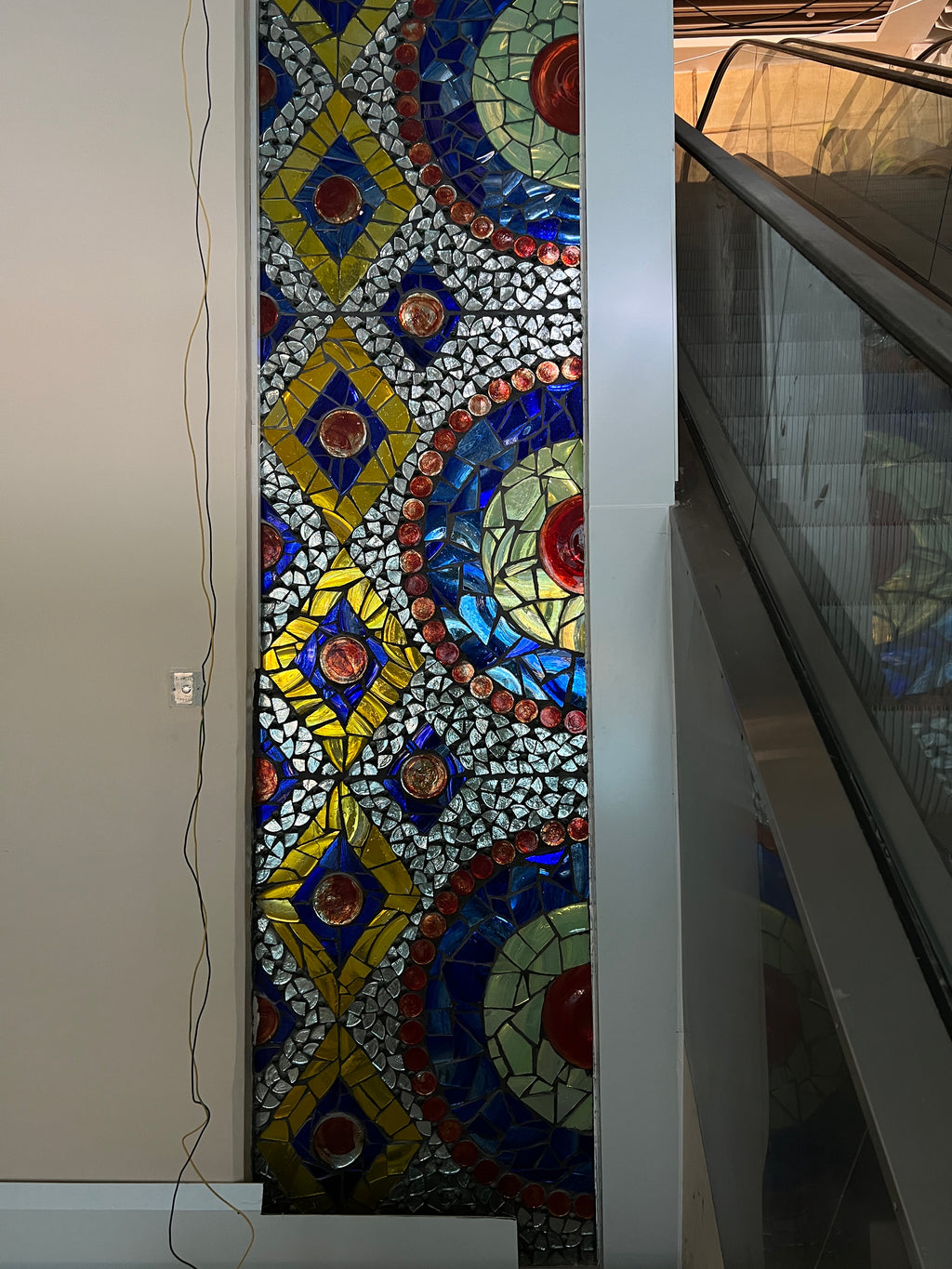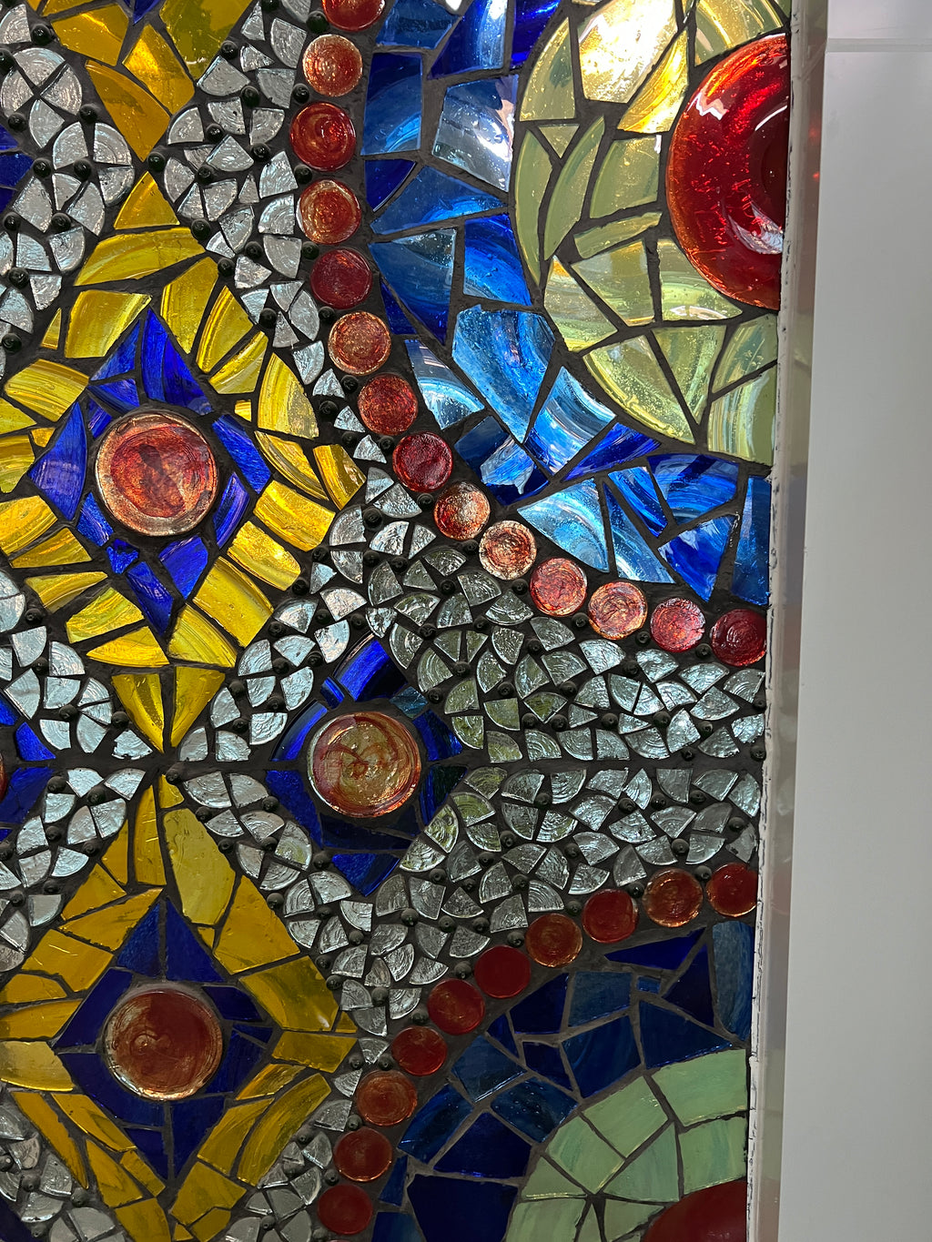 Our mosaic technique is versatile as a decorative style for wall art - prefabricated at the studio for speed of installation. Elements of blown & cast glass are tinted and assembled according to a pattern, then grouted.