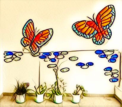 A butterfly piece on the verandah wall of an apartment in Westlands, July 2018. With scattered water drops from cast glass with a reflective backing for the backdrop, and some complementary garden jewellery hanging nearby. The second last picture is the sketch done for the client.