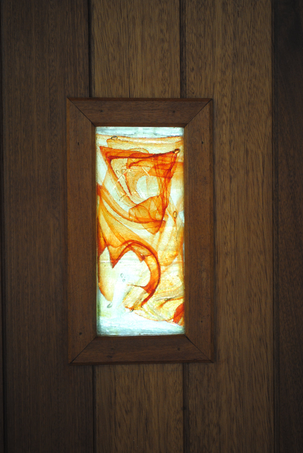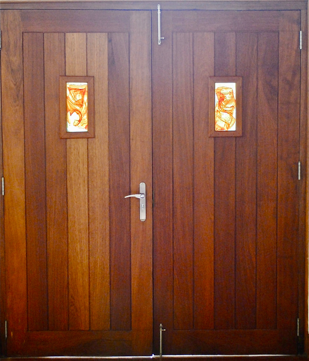 Small slabs in the leaves of an entrance door. Obscure, so only allows coloured light through, maintaining privacy.