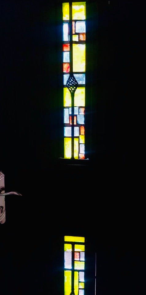 A small slab in the leaf of an entrance door. Obscure, so only allows coloured light through, maintaining privacy.