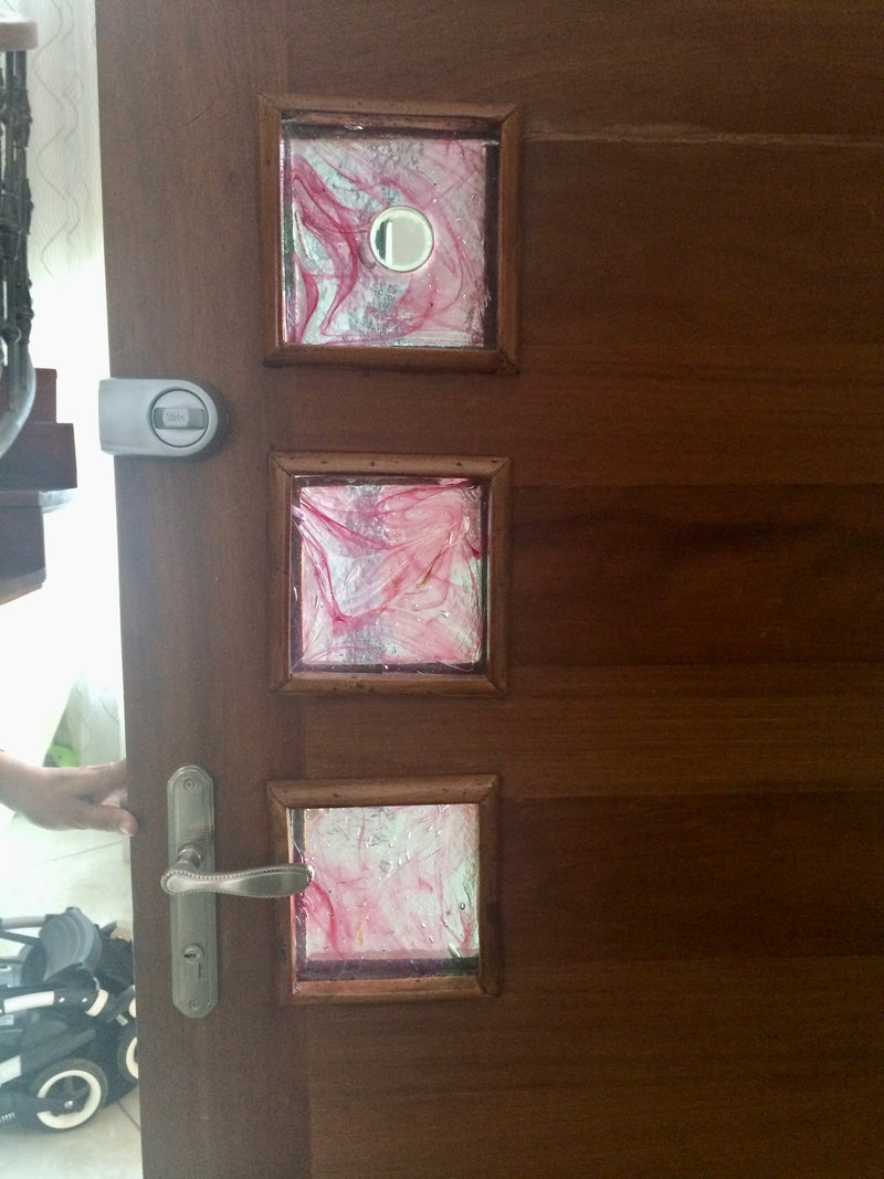 Obscure, so only allows coloured light through, maintaining privacy. Our client requested a peephole, so we drilled one into one of the blocks
