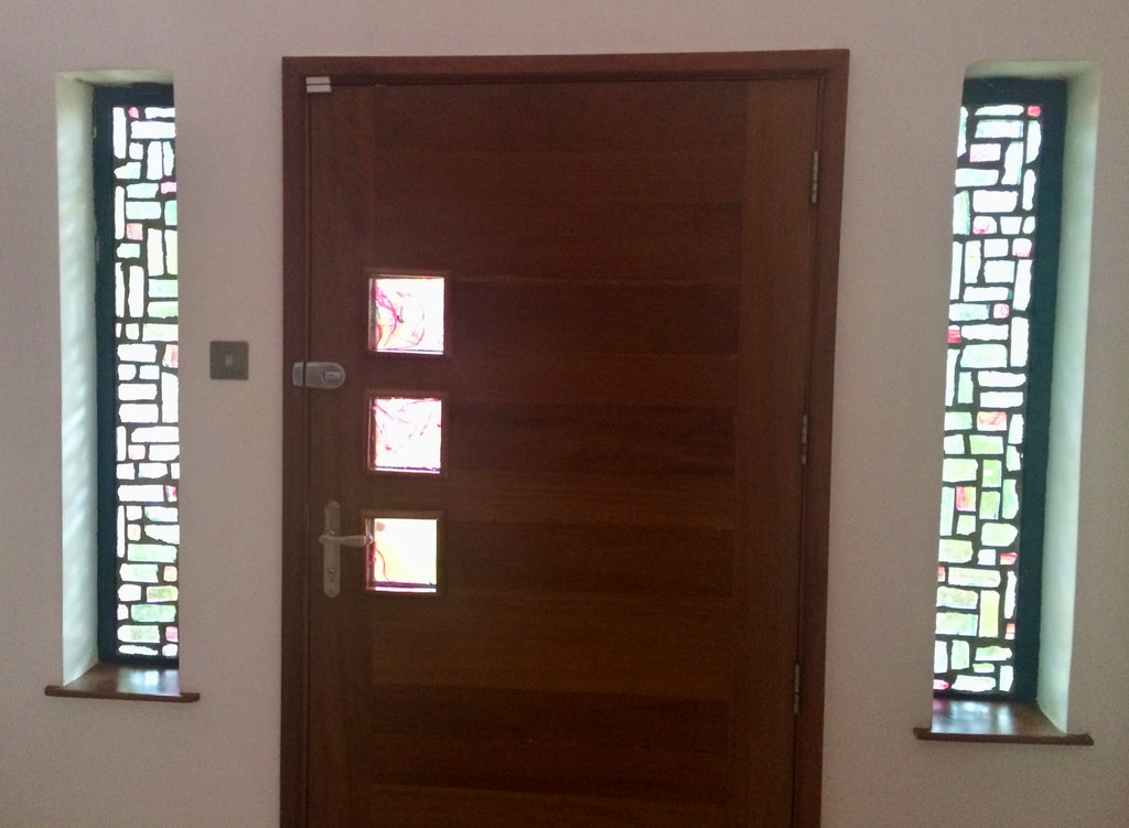Three small hand cast slabs in the leaf of an entrance door, with matching dalle surrounds.