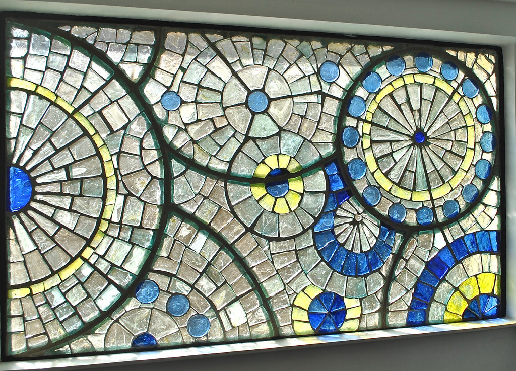A French technique using thick cast blocks of glass in a cement & steel matrix. Dalle de Verre is used by Kitengela Hot Glass to create tough, vibrant window panels & furniture.