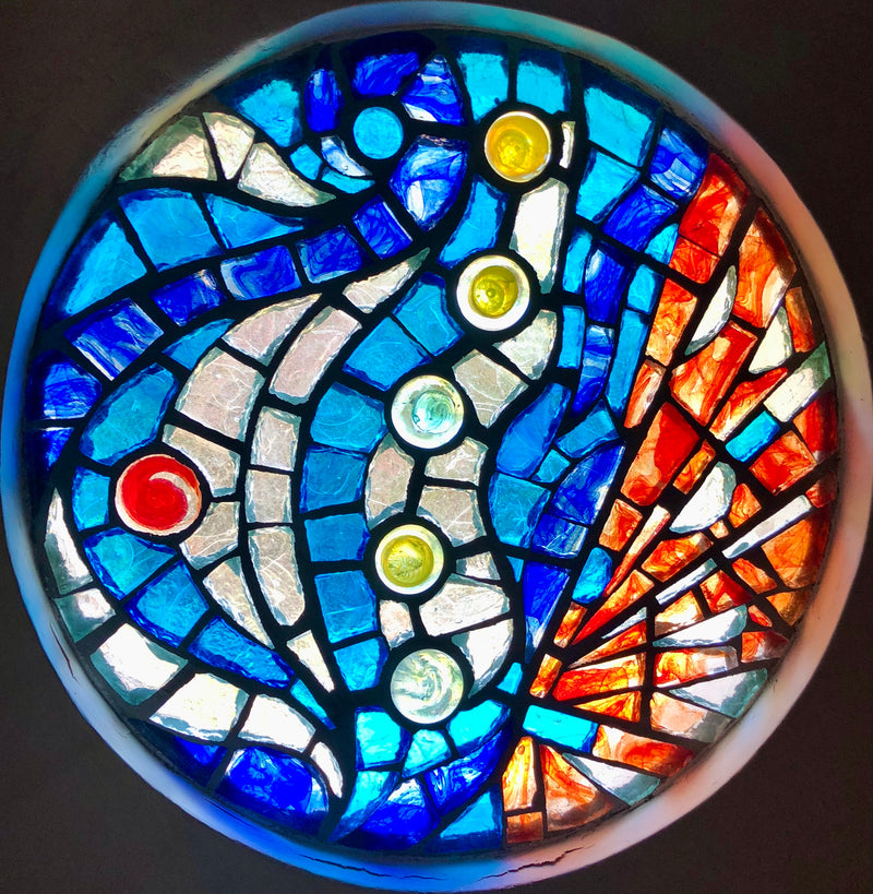 A French technique using thick cast blocks of glass in a cement & steel matrix. Dalle de Verre is used by Kitengela Hot Glass to create tough, vibrant window panels & furniture.